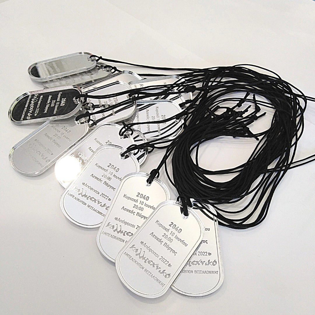 Σχολικό αναμνηστικό κολιέ αποφοίτησης ταυτότητα από ασημί καθρέπτη πλεξιγκλάς, ένα μοναδικό προϊόν με χάραξη λέιζερ.